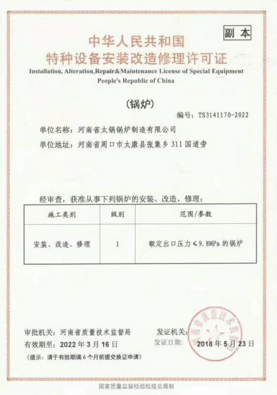 河南省太鍋鍋爐制造有限公司(原河南省太康鍋爐廠始建于1976年)始建于70年代初,經(jīng)40多年的艱辛探索,靠科技興業(yè),走科學(xué)管理之路,現(xiàn)已發(fā)展成為承接制造、安裝、設(shè)計大、中型供熱系統(tǒng),生產(chǎn):SZS燃油燃?xì)庹羝仩t、燃煤蒸汽鍋爐、燃油鍋爐、燃?xì)忮仩t、電加熱鍋爐、生物質(zhì)鍋爐、茶水鍋爐、有機(jī)熱載體鍋爐、熱風(fēng)鍋爐,蒸壓釜、燃油蒸汽鍋爐、燃?xì)庹羝仩t、燃油熱水鍋爐、燃?xì)鉄崴仩t并承擔(dān)安裝120噸熱水鍋爐、蒸汽鍋爐,生物質(zhì)鍋爐,加工制造一、二類蒸壓釜、壓力容器,化工機(jī)械的省一級**企業(yè)。